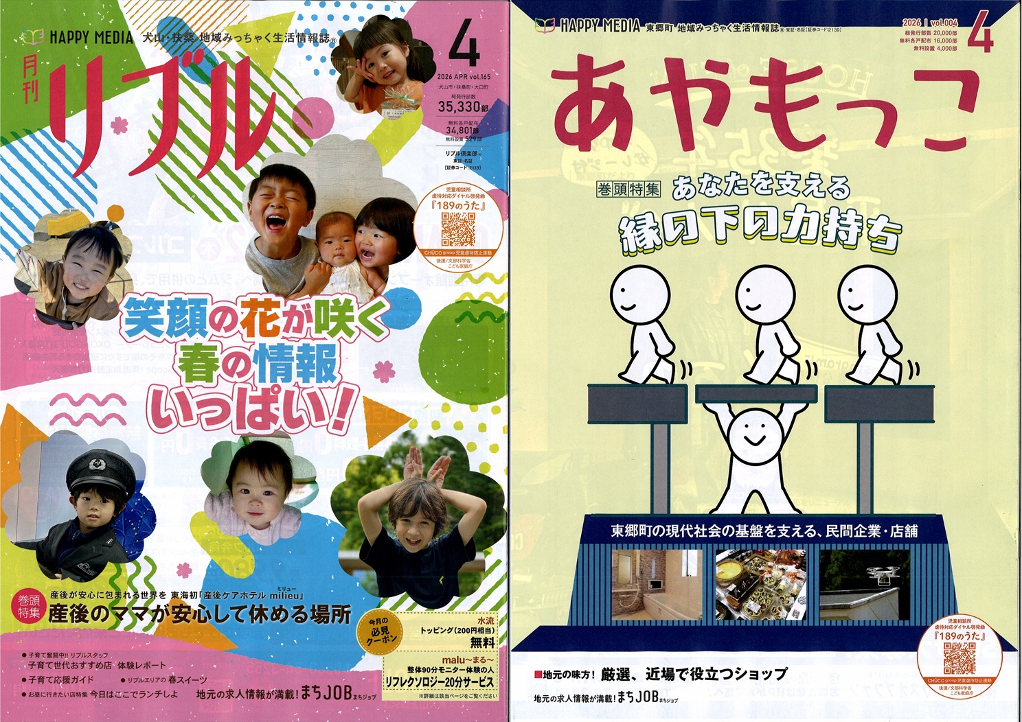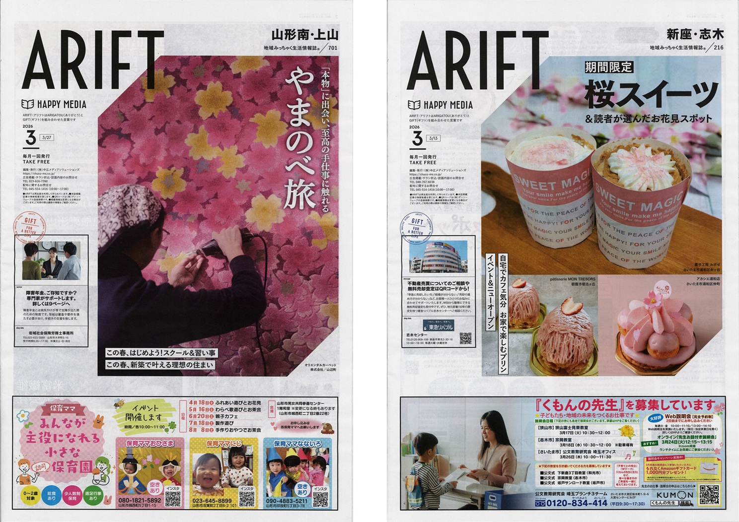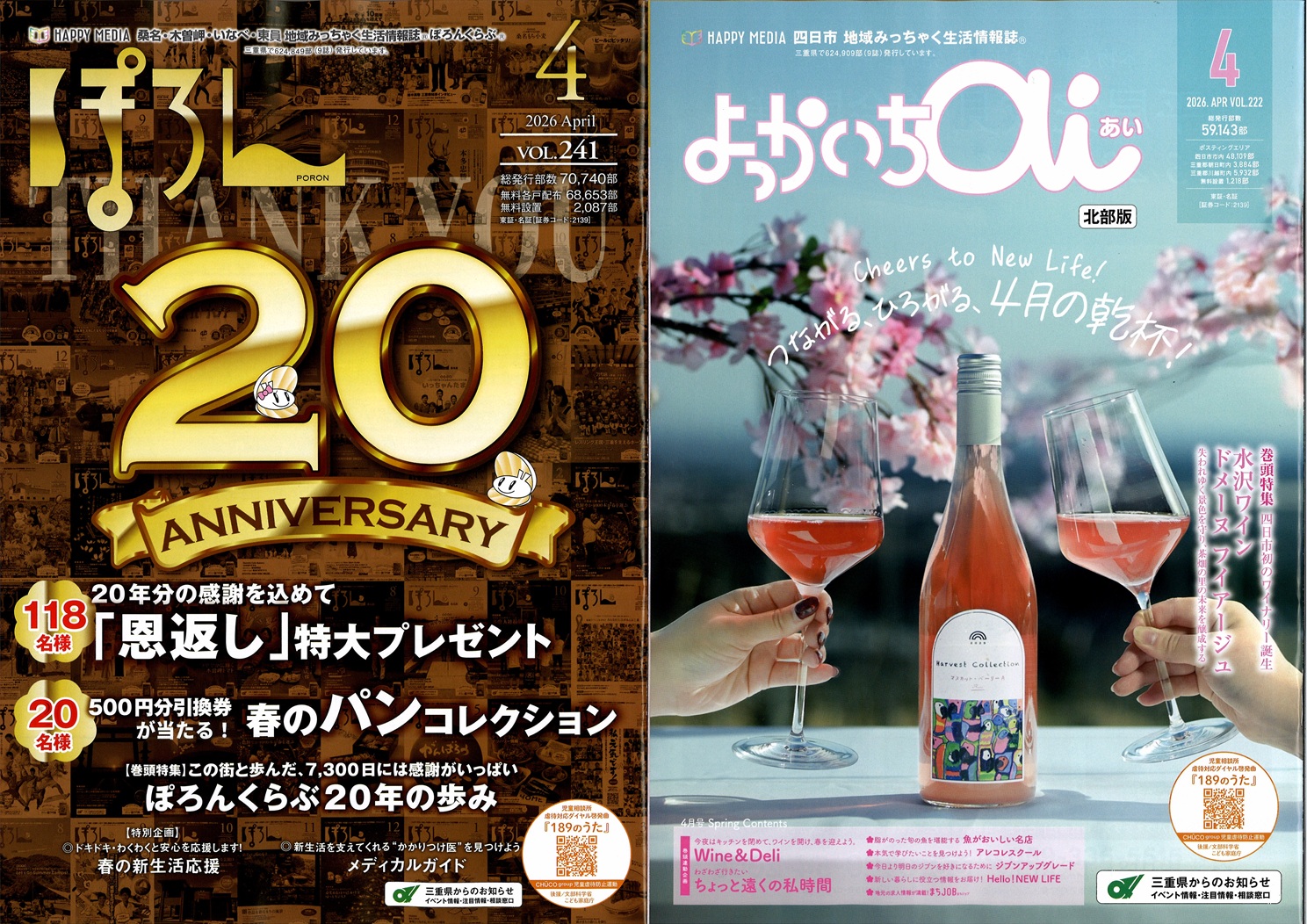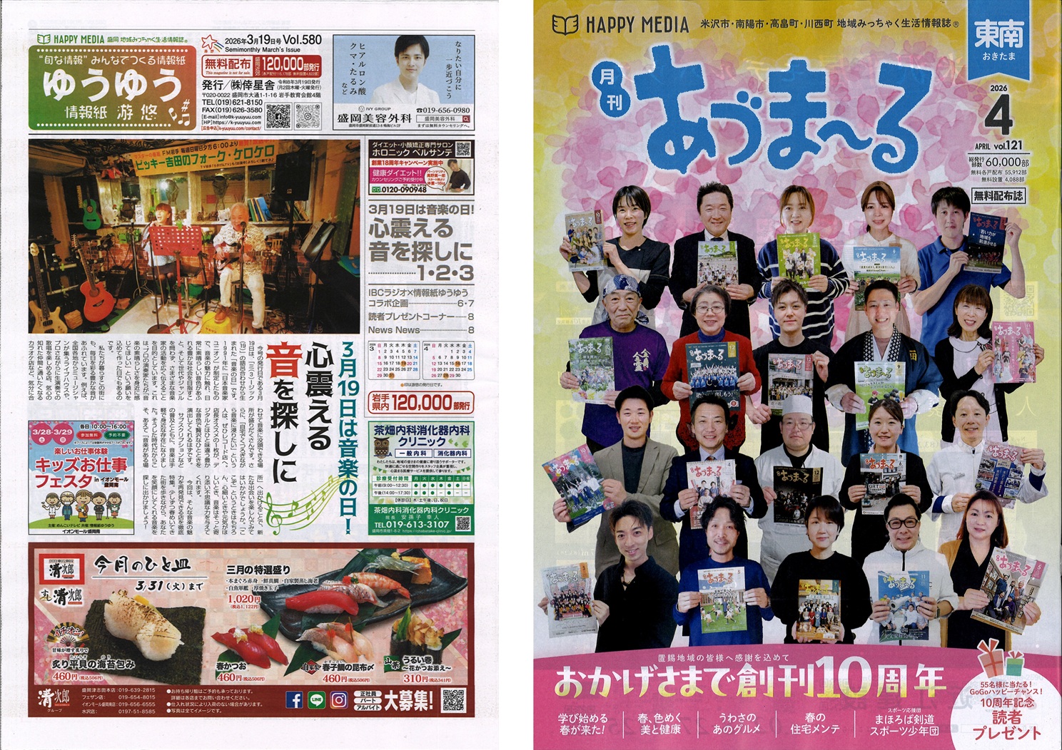 山形「あずまーる」10周年。米沢・南陽・長井・高畠・川西・白鷹・飯豊・小国と、着実に地域に根を下ろしています。三重・桑名市「ぽろん」20周年。創刊時の志が今に息づいています。